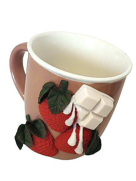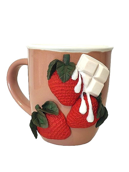 Adaugă un strop de magie momentelor tale de relaxare cu această cană unică, care combină eleganța designului cu rafinamentul detaliilor realizate manual. Fiecare cană este decorată cu o figurină din lut polimeric, lucrată cu mare atenție la detalii, ce prezintă câteva capșuni apetisante și o bucată dintr-o tabletă de ciocolată albă care se topește și curge încet peste ele, creând un efect vizual delicios. Contrastul între culoarea roz a cănii și roșul vibrant al capșunilor, alături de tableta de ciocolată albă, conferă un aspect elegant și atrăgător.