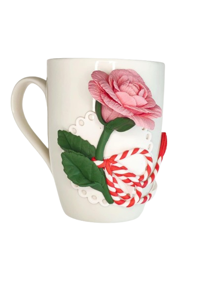 Această cană unică, realizată manual din lut polimeric, captează esența primăverii printr-un design delicat și plin de culoare. Cana cu trandafir roz, sculptat cu migală din lut polimeric, fiecare petală fiind plină de detalii fine care imită cu eleganță frumusețea naturală a acestei flori. Trandafirul este completat cu un șnur alb și roșu, creat tot din lut polimeric, care adaugă un element tradițional și simbolic, amintind de obiceiurile primăvăratice. Acest șnur, cu înțelesul său de Mărțișor, se împletește perfect cu trandafirul, sugerând renașterea naturii și sosirea unui nou început. Această cană este un obiect cu adevărat special, ideală pentru a sărbători venirea primăverii și a adăuga o notă de culoare și tradiție în viața de zi cu zi.