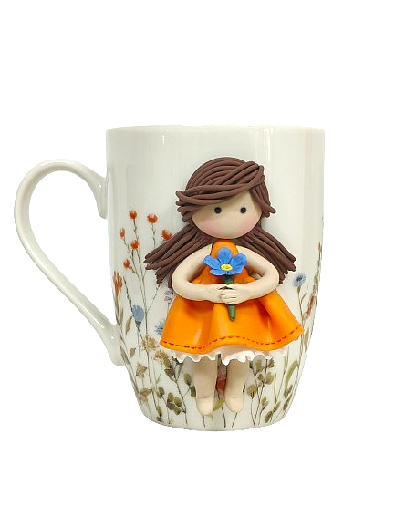 Adaugă un strop de magie în fiecare zi cu aceste căni adorabile ce conțin figurie din pasta polimerică, create cu grijă și atenție la detalii. Fiecare papușică este îmbrăcată într-o rochie elegantă cu două straturi: un strat de jupa albă care adaugă delicatețe și un strat de rochie portocalie, ce conferă un aer fermecător și vesel. În mâna ei, papușa ține o floare frumoasă, iar părul castaniu îi completează look-ul dulce și rafinat.