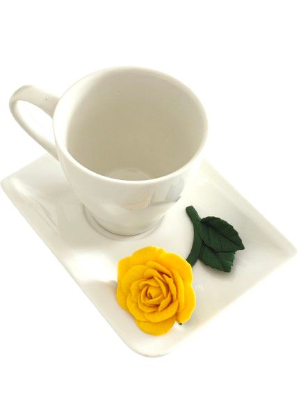 Adaugă un strop de eleganță și rafinament în fiecare moment cu acest set delicat, format dintr-o cească și o farfurie dreptunghiulară. Pe farfurie, se regăsește un trandafir minunat modelat manual cu grijă și pasiune, petală cu petală, pentru a crea o floare de o frumusețe aparte. Trandafirul este realizat cu multă atenție, fiind un simbol al rafinamentului și al fineții, care completează perfect designul elegant al setului.